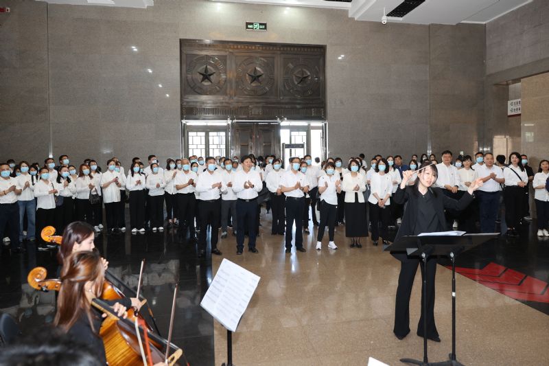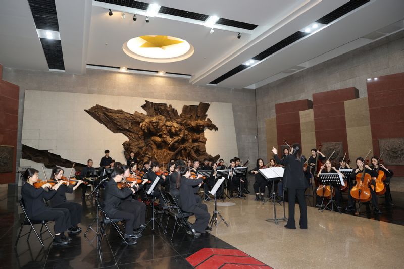 为进一步深入理解红色音乐作品背后的故事,增强艺术表现力和感染力,沈音·北方交响乐团近40名师生带着乐器走进辽沈战役纪念馆。在纪念馆序厅,伴随着沈音·北方交响乐团演奏的《红旗颂》《我和我的祖国》优美的旋律,学员们情不自禁地与师生共同唱起《我和我的祖国》,饱含深情的歌声在大厅内久久回荡,表达了亿万中华儿女对祖国滚烫的赤子之爱,也燃起了现场参观者心中最炽热的爱国之情。