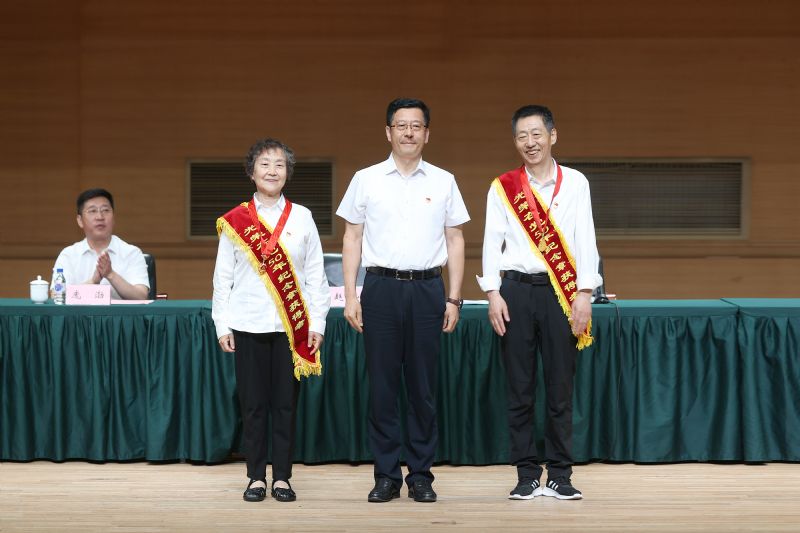 大会在全场齐唱《中华人民共和国国歌》激昂嘹亮的歌声中拉开帷幕。在赵恒心带领下,与会全体共产党员高举右拳,重温入党誓词。赵恒心代表学院党委为老党员代表张喜全、蒋泓颁发“光荣在党50年”纪念章。闫玉娇、张庆玫、赵桂君分别宣读《2021年以来荣获市级以上党建、思政、统战、纪检、学生及共青团工作奖项的个人和集体名单》《关于表彰2021-2022年度优秀共产党员、优秀党务工作者和先进基层党组织的决定》《关于表彰2021-2022年度优秀统战成员和先进集体的决定》。赵恒心、闫玉娇为荣获2021—2022年度学院优秀共产党员、优秀党务工作者和先进基层党组织代表,市级以上党建、思政、纪检工作先进个人和先进集体,学院党建创新项目、优秀专职组织员和专职党务工作人员颁奖。庞渤为荣获2021—2022年度学院优秀统战成员和先进集体,市级以上统战、学生和共青团工作先进个人和先进集体颁奖。表彰环节由张庆玫主持。