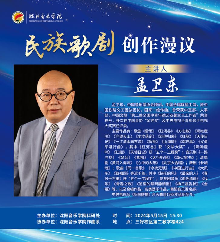 嘉宾简介:孟卫东,中国音乐家协会顾问,中国合唱联盟主席,原中国铁路文工团总团长,国家一级作曲。曾荣获中宣部、人事部、中国文联“第二届全国中青年德艺双馨文艺工作者”荣誉称号,多次在中国音协“金钟奖”及中央电视台青年歌手电视大奖赛任评委。