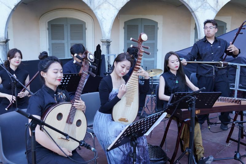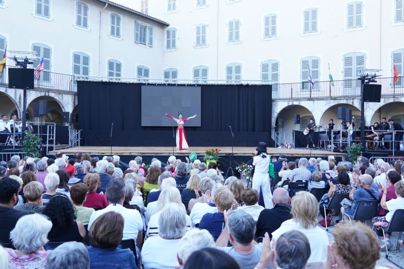 法国当地时间7月7日,我院代表团在罗芒市国际博物馆花园与罗芒市主管文化事务的副市长大卫·罗伯特(David Robert)、罗芒音乐节主席阿兰·尚佩(Alain Champey)会谈并交换礼物。当晚,代表团参加了罗芒站巡演最盛大的闭幕式演出,近千名观众观看演出。