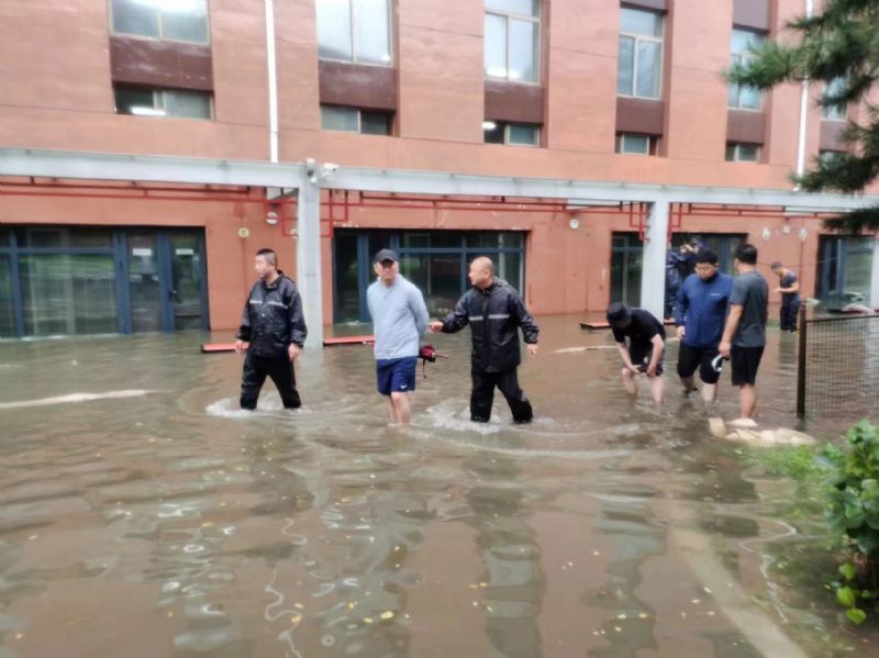 在学院党委的安排部署下,后勤基建处、保卫处等相关部门迅速行动,第一时间召开安全工作会议,组建应急指挥小组。学院分管安全和后勤工作的领导靠前指挥、深入一线,实地检查指导各项防汛工作。后勤基建处安排专人24小时值班巡查,及时排查处理风险隐患,确保发生险情第一时间报告,第一时间处置。后勤人员冒雨全面检查屋面排水口、排水管道,排查建筑物有无漏水、洪水倒灌、设施损坏等情况;对变电所、室外箱变、配电系统不间断巡查,重点巡查电缆沟积水、电梯井积水及各楼用电设施设备;对易积水点进行严密监控,调度排污车、抽水泵对下水井和积水地点及时排水。在沈三校区发现处理积水16处、建筑物漏水21处,清理排水渠、排水管道42处,清理树木折断13处,共排危排险70余处。保卫处组织人员在暴雨过后快速清理校门处积水,方便车辆人员进出;加强校园巡逻频次,发现楼宇漏点快速处置抢修;坚持值班值守,第一时间发现雨水倒灌室内险情,并快速组织人力开展防汛抢修工作,将财产损失降到最小。