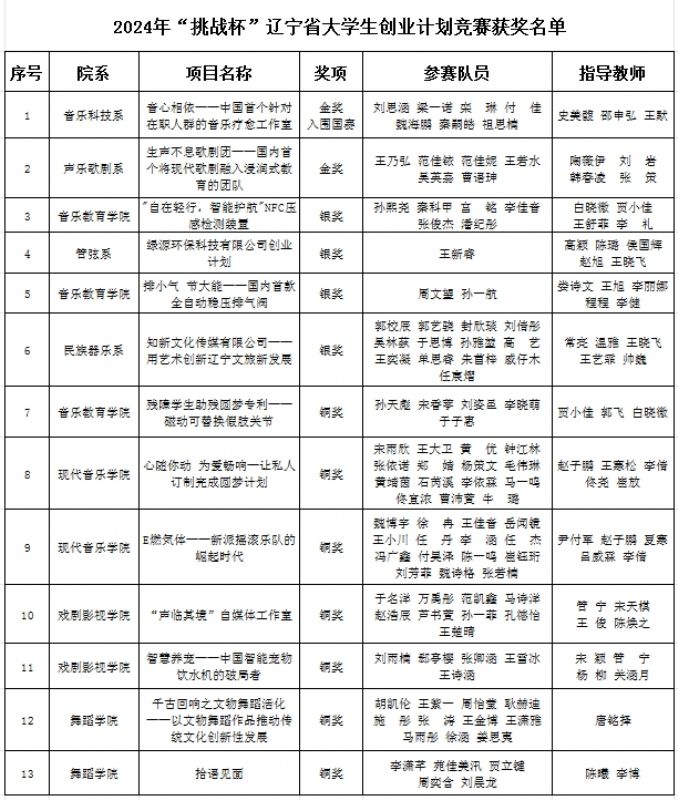 由共青团辽宁省委员会、辽宁省教育厅、辽宁省科学技术厅、辽宁省人力资源和社会保障厅、辽宁省知识产权局、辽宁社会科学院、辽宁省科学技术协会、辽宁省学生联合会联合主办,沈阳化工大学和辽宁省交通高等专科学校共同承办的2024年“挑战杯”辽宁省大学生创业计划竞赛中,我院13项作品喜获佳绩,其中荣获金奖2项、银奖4项、铜奖7项,1项作品入围国赛。