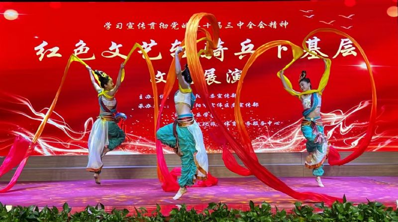 文艺展演在“红色文艺轻骑兵”小分队成员《灯火里的中国》深情悠扬的歌声中拉开了帷幕。竹笛独奏《万疆》,温婉细腻的曲调娓娓道来,优美的旋律充满蓬勃朝气和希望,表达出对祖国大地国泰民安的赞美之情。二胡演奏《光明行》以“中国气派”进行曲的形式,通过激昂有力的曲调和豪迈乐观的情绪,展现了人们对美好未来的向往和不断追求进步、趋向光明的愿望。 歌曲《新征程》是一首充满希望与励志之歌,号召广大人民群众为实现中华民族伟大复兴贡献力量;令人心潮澎湃的歌曲《红旗飘飘》,旋律深情激昂,表达了对祖国的深厚热爱和赤诚之心。独舞《远方》展现出蒙古族舞蹈浑厚、含蓄、舒展和豪迈的特点,展现了蒙古族人民的豪放性格与坚毅勇敢,表达了草原儿女对远方的憧憬与向往。三人舞《闻法飞天》是根据敦煌壁画盛唐时期的六臂飞天形象改编而成,以红、蓝、绿色长达二十四米的彩绸,夸张地将飞天振臂高飞的欢畅情绪一步步推向高潮。每个节目既有特色,又能引起观众共鸣,现场掌声阵阵,观众热情高涨。展演在激情澎湃的大合唱《中国向前进》中落下帷幕。
