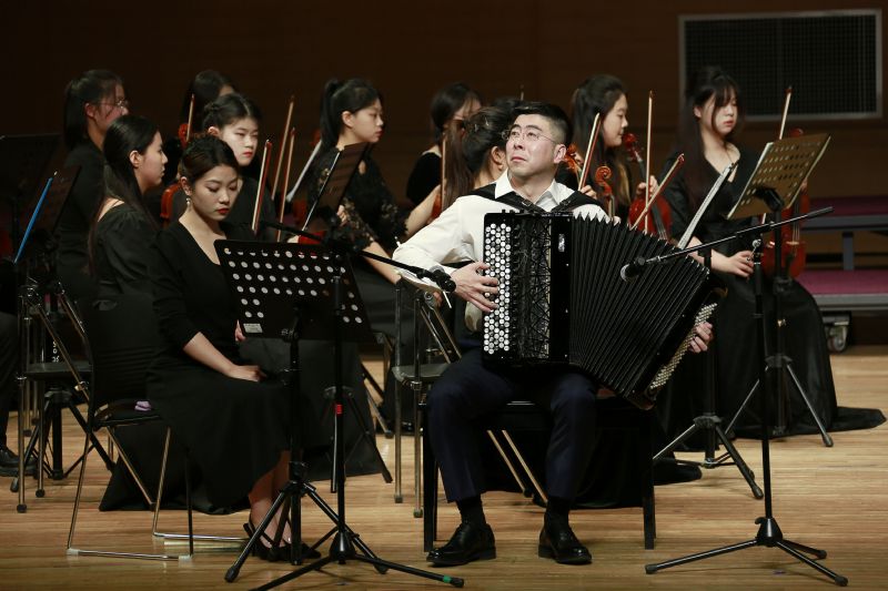 “呦呦鹿鸣,食野之苹。我有嘉宾,鼓瑟吹笙……”纯净稚嫩的童声响起,仿佛穿越千年的时光隧道,将《小雅・鹿鸣》的诗意画卷徐徐展开。童声合唱清脆的歌声、古老诗句的韵律与情感,充满生机,如同春日里欢快跳跃的溪流,沁人心脾,令人对传统文化的热爱与敬意之情油然而生。巴扬手风琴协奏曲《欢乐之声》,弦乐团演奏的悠扬旋律如轻柔的微风,与附属中等音乐学校校长曹野教授演奏的巴扬手风琴相互交织,时而急促的快板,节奏明快而有力;时而舒缓的慢板,宁静而悠远,绘就一幅宏大、细腻的音乐世界,令观众沉浸在如诗如画的意境中。管弦乐团为观众呈现的《卡门序曲》,熟悉的旋律、强烈的节奏与鲜明的风格瞬间点燃现场气氛;而《我的祖国》,以其悠扬的曲调、柔美的旋律及磅礴的气势交相辉映,表达出师生们对祖国母亲的无限热爱与深深眷恋。