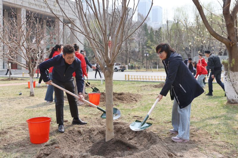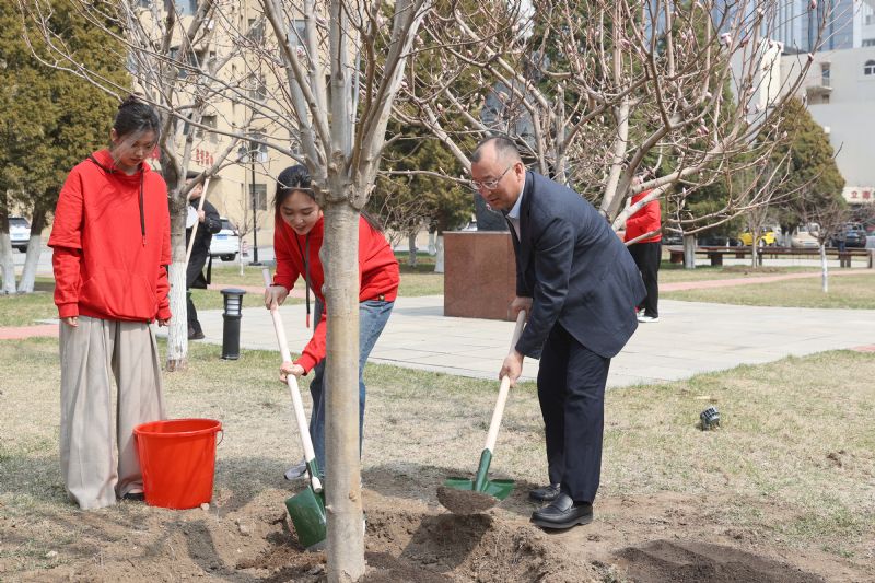 春风催新绿,最美四月天。为积极响应《辽宁省教育厅2025年生态环境保护教育工作计划》,提升校园绿化品质、营造优美校园环境、助力“美丽辽宁”建设,4月7日上午,学院在三好校区开展义务植树活动。党委书记赵恒心,党委副书记、院长田彦,党委副书记孙旭东,副院长庞渤、王硕、张策,院长助理刘小龙参加活动,与学生代表共同为校园增添新绿,为未来播种希望。