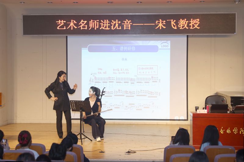 随后,宋飞为现场师生作精彩的学术讲座。她以案头作业、读谱唱谱、视奏、诠释音乐、深挖内涵五个阶段的二度创作过程为脉络,层层剖析了演奏者如何将乐谱符号转化为富有生命力的音乐语言,从而达到情感与技巧的高度统一。她强调,二度创作是自我雕琢的过程,既要突破乐器与演奏习惯的局限,又要融入个性化的艺术表达。这不仅是对演奏技术层面的精准把控,更是对音乐灵魂的深度唤醒,她鼓励学生探索个性化的演奏方案,让技术服务于情感表达。宋飞以二胡曲《巾帼》为例展开分析。该作品以音乐为载体讴歌女性英雄,由沈阳音乐学院知名校友、浙江音乐学院王云飞副教授创作,经宋飞首演后广为传播。宋飞在讲解过程中以示范演奏与文化解读相结合的方式对谱面展开剖析,并做出具体的技法要求,生动、全面、准确地为在场师生解析演奏要领。在讲座的最后,来自我院附中、本科、研究生三个培养层次的学生代表分别登台演奏二胡曲《巾帼》片段,宋飞就演奏技巧、音乐处理、体态律动等方面对学生进行有针对性的指导,助力学生有效提升演奏能力和艺术表现力,让他们的音乐演绎更具艺术感染力。