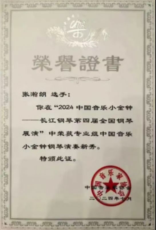 我校学生张翰林在“2024中国音乐小金钟长江钢琴第四届全国钢琴展演”中荣获专业组中国音乐小金钟钢琴演奏新秀