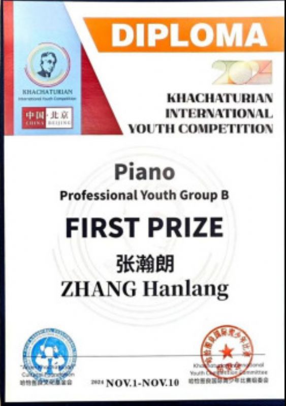 我校钢琴专业学生张瀚朗在2024年哈恰图良国际青少年音乐比赛中,荣获青少年专业B组第一名和中国作品最佳演奏奖