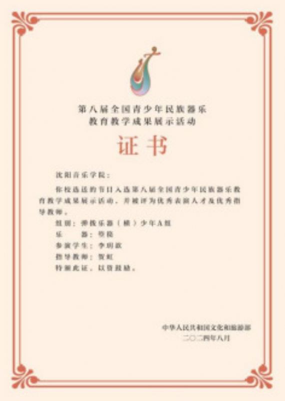 我校箜篌专业学生李玥歆在第八届全国青少年民族器乐教育教学成果展示活动并被评为优秀表演人才