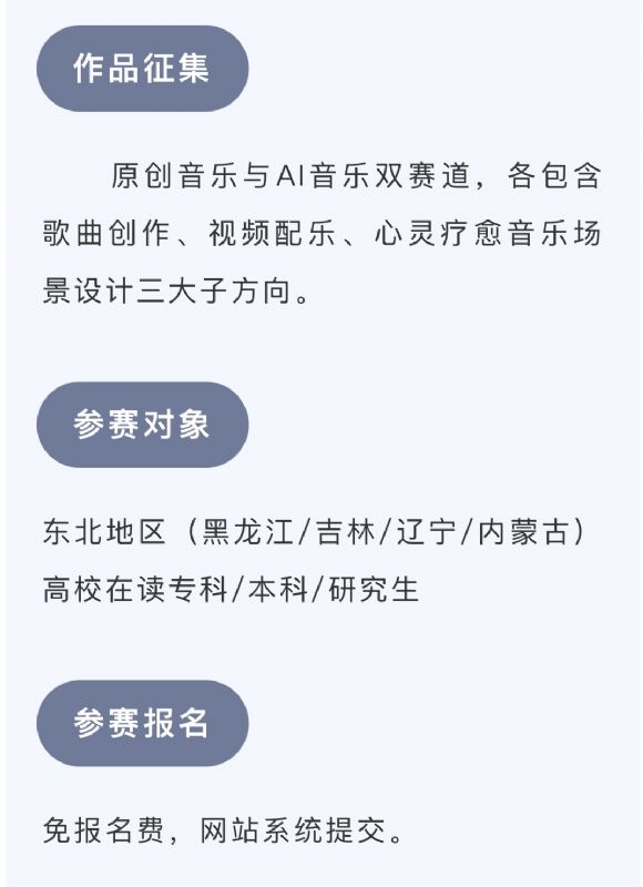 大赛分为原创音乐与AI音乐双赛道,每个赛道各包含歌曲创作、视频配乐、心灵疗愈音乐场景设计3个子方向,共6个子赛道。