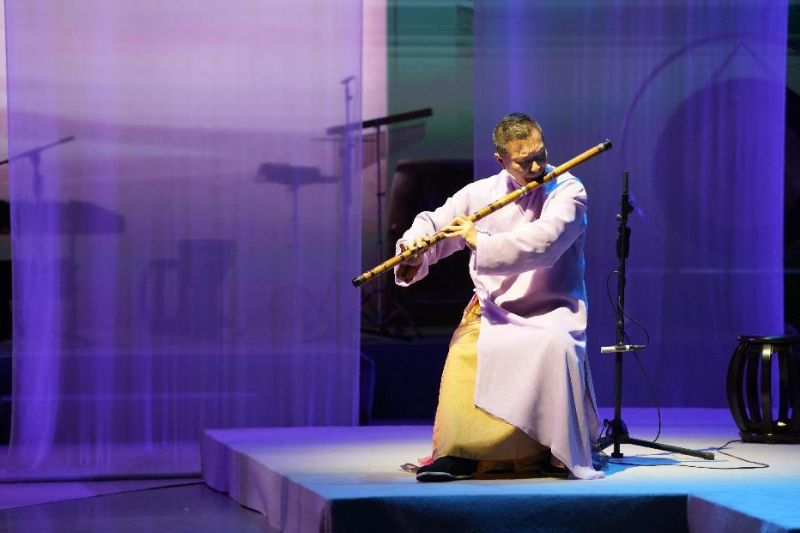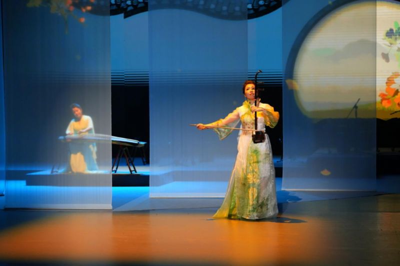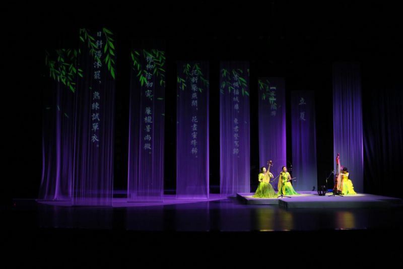 音乐会在一曲清泉般的《流水》中拉开帷幕。古琴弦动,泠泠淙淙,仿佛冰消雪融,山涧溪流挣脱寒冬的束缚,带着初春的清新与活力,汩汩流淌,奏响生机盎然的第一声问候。作品《惊蛰》中的打击乐如滚滚春雷骤然炸响,充满原始力量的节奏瞬间唤醒沉睡的生灵,暖风拂面,夏意悄临。《立夏》让夏天的气息涌动全场,琵琶、二胡和箜篌交织出一幅万物并秀、新荷初绽的初夏图景。作品《小满》中,高音阮弦音宛转,如微风轻抚过待熟的麦浪,悠扬的笛声,恰似农人对丰收的殷切期盼。