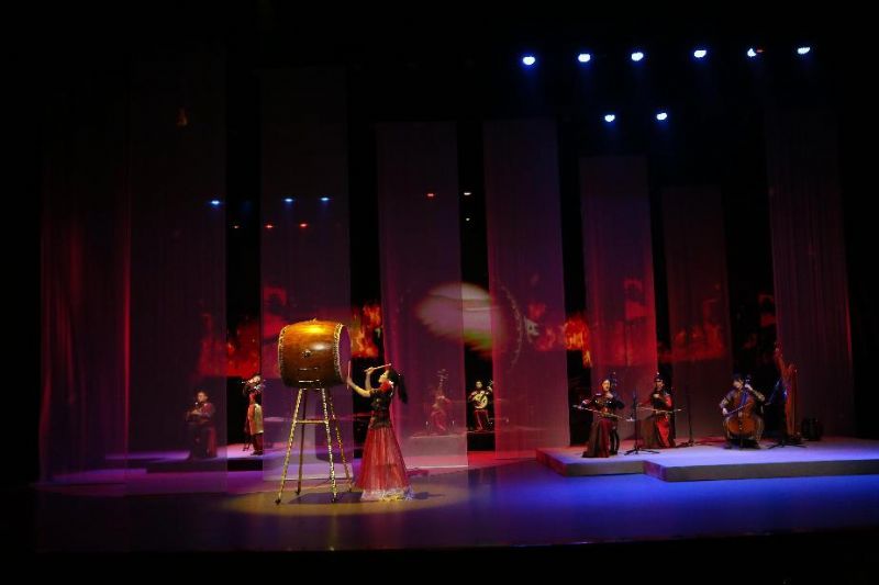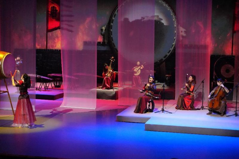 《夏至》奏响,高亢清越的笙音喷薄而出,古筝的弦音密集如骤雨,和中阮共同奏响盛夏最激昂的乐章。《大暑》通过竹笛悠扬的旋律与箜篌的“嘈嘈切切错杂弹”,将大暑时节万物在极限环境下迸发的顽强生命力渲染得淋漓尽致。战鼓声起,穿云裂石,一曲气势恢宏的《秦王破阵乐》回荡在剧场内,笛声激越昂扬,充满了磅礴的古意与蓄势待发的力量,在夏日的尾声激荡起雄浑壮阔的回音。凉风初至,暑意未消,《立秋》将古筝与二胡深情对话,弦音交织缠绕。