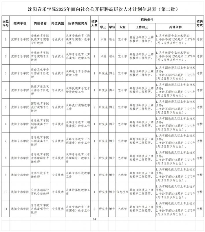 沈阳音乐学院2025年面向社会公开招聘高层次人才计划信息表(第二批)