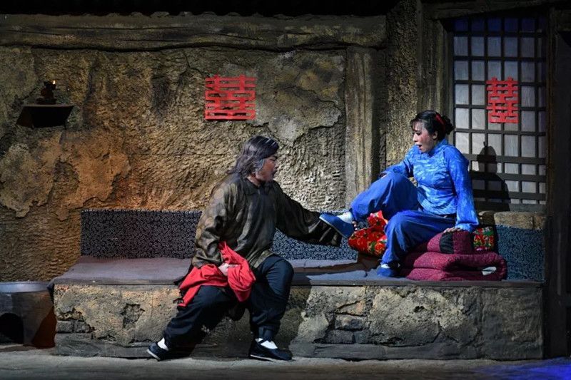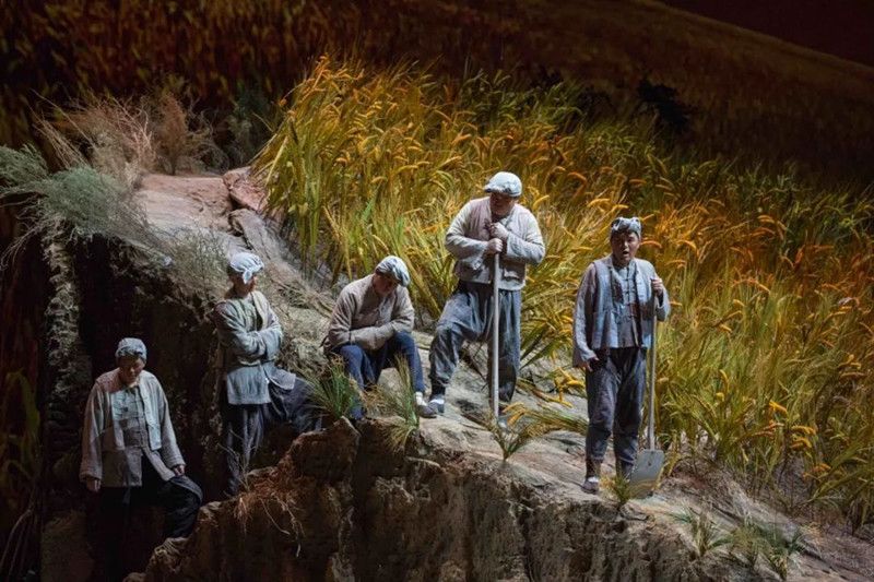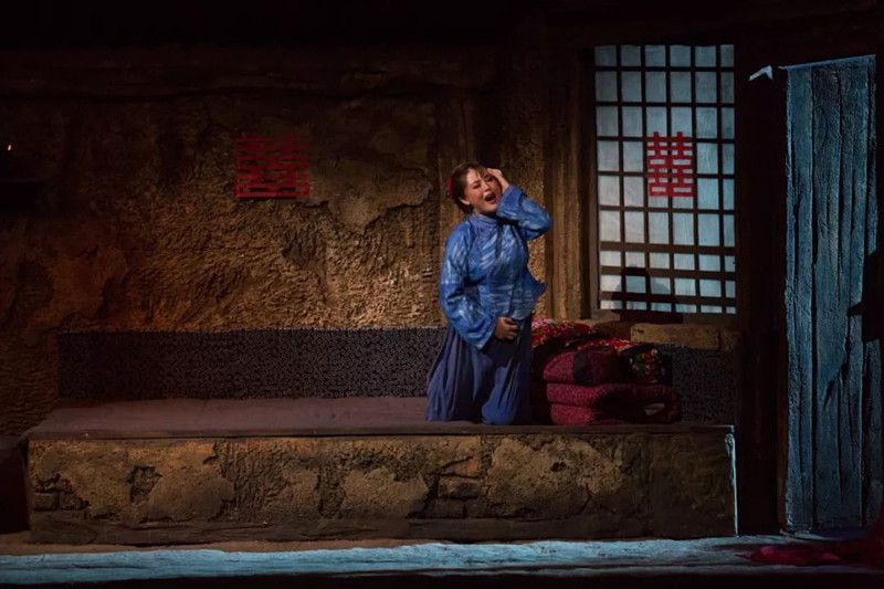 例如被作曲家称之为“核心唱段式咏叹调”的兰花花与骆驼子的二重唱“圆圆的月亮挂在天上”,是兰花花与骆驼子这对儿恋人重要的爱情表达唱段。其旋律优美动听,情感质朴单纯。尤其唱中“天上”“心上”同音落音的一高一低,支声复调与心境表达的一分一合,以及“苦(花)音”飘然而至的清新效果,无不从听觉上展示出这个唱段的唯美品质。
