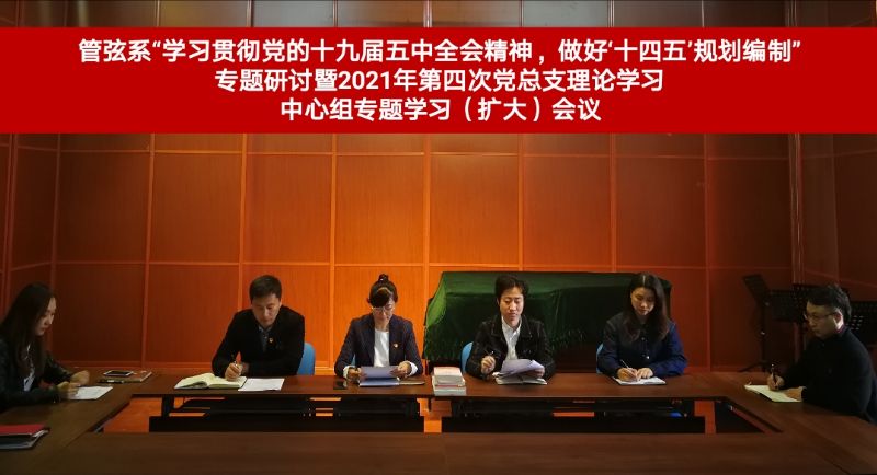 5月12日,管弦系召开党总支理论学习中心组学习(扩大)会议,针对“学习贯彻党的十九届五中全会精神,做好‘十四五’规划的编制工作”进行专题研讨;集体学习党史学习教育第一专题:“深刻铭记中国共产党百年奋斗的光辉历程”、《中国共产党组织处理规定(试行)》、习近平总书记关于绿色低碳发展的重要论述、习近平总书记在福建考察时的重要讲话精神、习近平总书记在清华大学考察时的重要讲话精神、习近平总书记致厦门大学建校100周年贺信精神等内容。党总支理论学习中心组成员、党支部书记、教研室主任参加会议。会议由党总支书记陈璐主持。