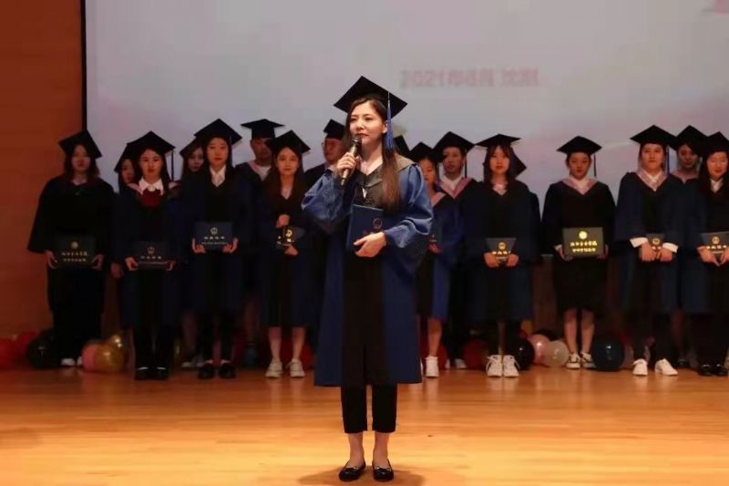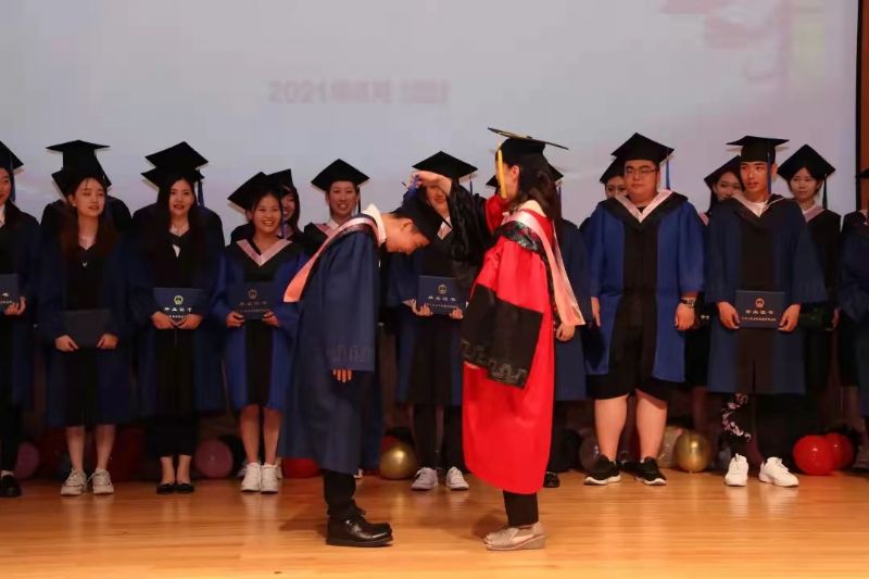 董蓉为2021届本科毕业生及硕士研究生毕业生正冠拨穗,并颁发学位证书。张威宣读了音乐学系2021届毕业生毕业及学位授予相关文件。