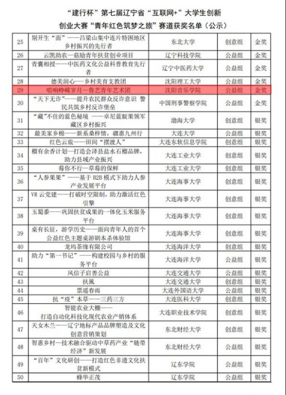 7月24日—28日,由辽宁省教育厅主办的第七届辽宁省“互联网+”大学生创新创业大赛暨第七届“互联网+”中国国际大学生创新创业大赛辽宁省赛区决赛在中国医科大学及网络端举行。我院民族声乐系《唱响峥嵘岁月——鲁艺青年艺术团》学生团队从94所高校的3万余个参赛项目中脱颖而出,获得省赛金奖的优异成绩,实现了我院在创新创业大赛上的历史性突破。