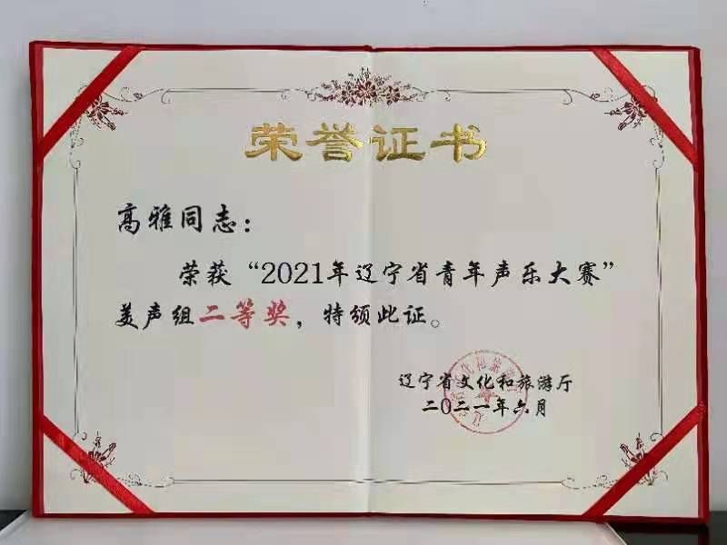 2021年6月21-23日,由辽宁省文化和旅游厅主办的辽宁省第六届文化艺术政府奖“文华奖”单项奖——“2021年辽宁省青年声乐大赛”在沈阳辽宁大剧院举行。经过视频选拔,共有来自全省各级各类专业艺术表演团体和艺术院校师生共58名选手进入了本次比赛的复赛。比赛分为美声组、民族组、流行组三个组别。各组别设一等奖一名,二等奖两名,三等奖四名,优秀奖五名。经过激烈的角逐,每个组别各有12名选手进入了决赛。