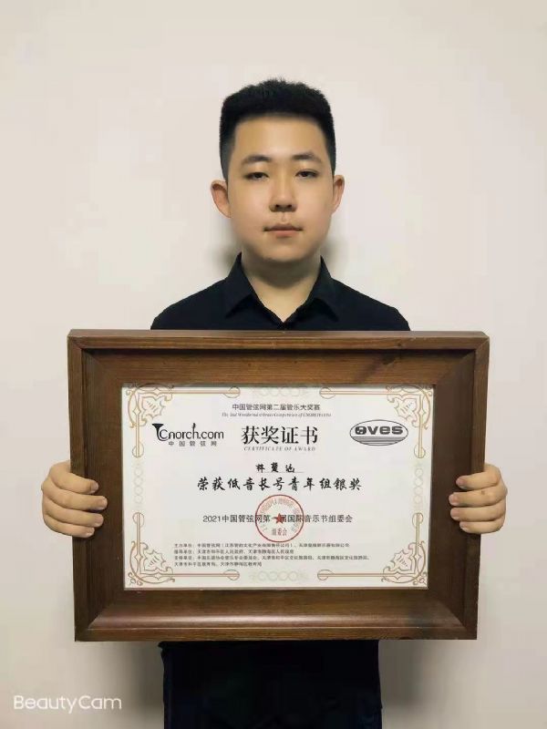 在2021年7月29--31日,由中国管乐网主办的第二届管乐大奖赛(线下)在天津举办,我校管弦学科学生林楚涵跨组参加青年组比赛荣获低音长号银奖,主教教师刘兵。