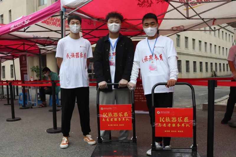 在现场接待点,志愿者热情洋溢、各环节秩序井然、各流程顺畅高效、温馨和谐,向新生全面展现了民族器乐系的管理服务水平和精神风貌。身穿红色志愿服、佩戴志愿牌的志愿者们忙碌在校园的各个角落,帮萌新们进行线路指引、行李搬运、引导、咨询、购买生活用品等,是人来人往的校园里最美丽的风景线。经过第一天的工作,新生们被志愿者的热情所感染,自发地加入到志愿者团队中。
