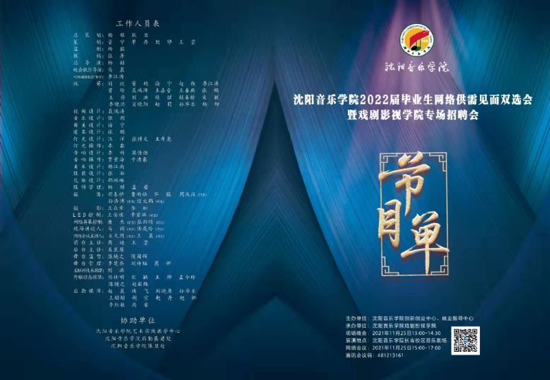 2021年11月25日,为贯彻落实沈阳音乐学院党委关于统筹做好疫情防控和2022届毕业生就业服务工作的部署和要求,在沈阳音乐学院创新创业中心、就业指导中心的指导下,沈阳音乐学院2022届毕业生网络供需见面双选会暨戏剧影视学院专场招聘会在长青校区音乐剧场隆重举行。