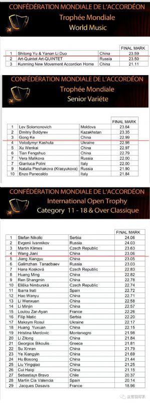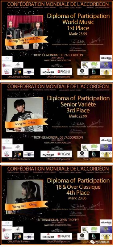 在刚刚结束的第71届世界手风琴锦标赛(CMA)中,经过两个月的层层选拔,从中国赛区预选赛到世界总决赛激烈角逐,钢琴系曹野副教授指导的学生:研究生于诗童、李娅楠获得世界音乐组第一名,本科生龚克获得成人流行组第三名,王佳霓获得国际公开组第四名(本组排名第一的中国人),为沈阳音乐学院取得本项赛事最为优秀的成绩。同时沈阳音乐学院附中吴东奇、党正宇也取得了优异成绩。