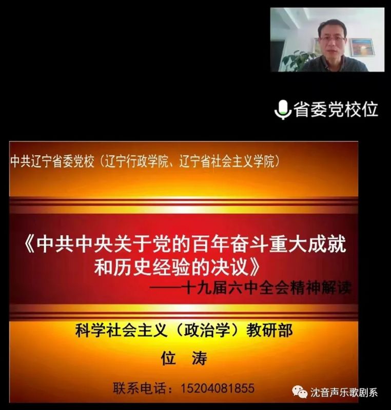 11月23日,声乐歌剧系党总支邀请辽宁省委党校位涛教授作《中共中央关于党的百年奋斗重大成就和历史经验的决议——党的十九届六中全会精神解读》专题讲座。位涛教授用生动的语言和丰富的实例,从党的百年奋斗重大成就和历史经验的重大意义为切入,讲解“三次飞跃”“四个伟大成就”“五大历史意义”“十大经验”等内容,全面、系统、深入地解读党的十九届六中全会精神,以大量的例子、生动的比喻详细分析当前局势,引导大家深刻认识《决议》作为一份光辉的马克思主义纲领性文献,是新时代中国共产党人牢记初心使命、坚持和发展中国特色社会主义的政治宣言,是以史为鉴、开创未来,实现中华民族伟大复兴的行动指南。
