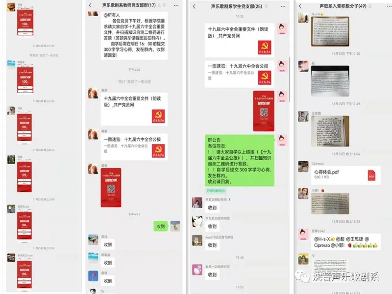 声乐歌剧系党总支充分利用人民日报、学习强国等平台,结合看新闻、听解读等形式对党的十九届六中全会精神进行再学习、再强化,积极营造学习气氛。在微信群中分享《党的十九届六中全会重要文件(朗读版)》《一图速览:党的十九届六中全会公报》《学习党的十九届六中全会精神知识自测》等学习资料,引导师生自觉梳理内容、搭建体系,强化认识和理解,激发学习兴趣和热情,帮助师生准确把握党的十九届六中全会精神的丰富内涵与核心要义,从党的百年奋斗历程中不断汲取智慧和力量。