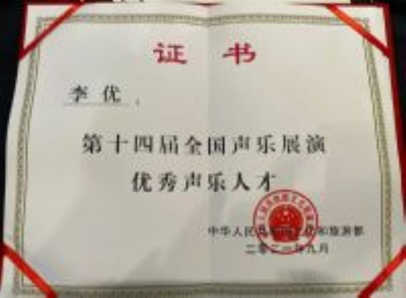 • 9月19日、20日晚,“全国声乐领军人才培养计划”暨第十四届全国声乐展演民族组在哈尔滨音乐厅举行。我院民族声乐系教师李优作为参加展演评比的选手,从众多选手中脱颖而出,获得了参加培养计划的资格,荣获了由中华人民共和国文化和旅游部颁发的“优秀声乐人才”证书。