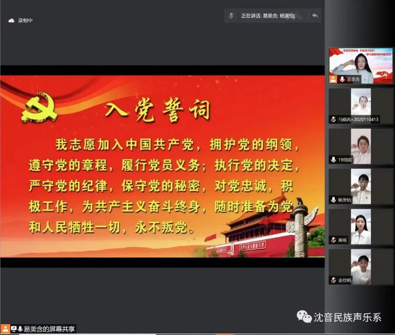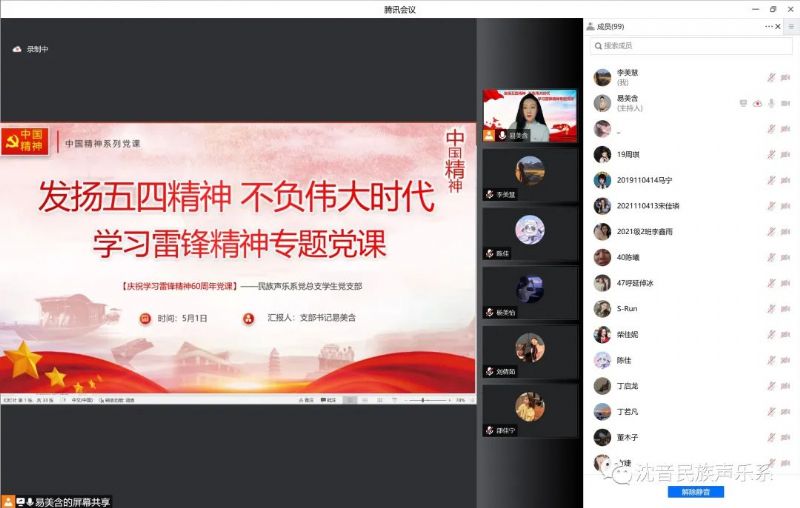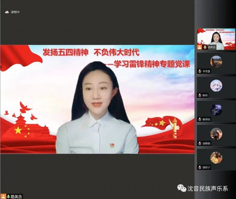 喜迎二十大,永远跟党走,奋进新征程!今年是中国共产主义青年团成立100周年,为深入贯彻习近平总书记关于弘扬雷锋精神的重要指示精神,贯彻落实《新时代爱国主义教育实施纲要》《新时代公民道德建设实施纲要》,大力培育、弘扬和践行新时代雷锋精神,持续推进民族声乐系“党建➕一年级育人工程”,教育引导广大学生厚植爱国主义情怀,把雷锋精神代代传承下去。在五四青年节到来之际,5月1日,民族声乐系党总支学生党支部开展了“发扬五四精神,不负伟大时代——学习雷锋精神”专题党课学习。学生党支部书记易美含作为主讲人,辅导员王国峰、学生党员、入党积极分子、入党申请人、红旗读书班”成员及全体本科一年级同学参加了本次党课学习。