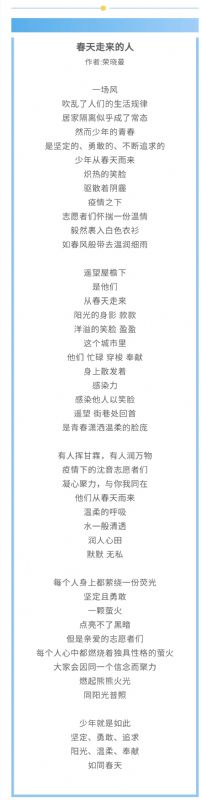 •       疫情牵动人心,文艺凝聚力量。为展现我院师生“艺”心抗疫、勇于担当的精神风貌,凝聚起勠力同心、阻击疫情的强大正能量,戏剧影视学院党总支立足我院专业优势,统筹各系专业力量,开展以“‘艺’心抗疫 聚力同行”为主题的原创诗歌云展播活动,向在疫情防控歼灭战中无畏艰险、冲锋在前的逆行者们致敬。