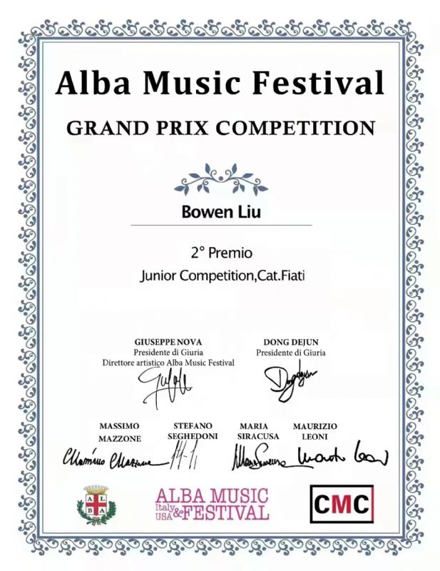阿尔巴国际音乐比赛由意大利Alba市政府主办,"Giorgio Busca"大剧院与Classic music center音乐协会协办的Alba音乐节之国际音乐比赛于11月举办,由于国际疫情原因比赛为线上进行。比赛旨在发现更多的古典乐优秀青年演奏家,并通过协会平台给予演奏家们在意大利各大音乐节、意大利各大剧院、音乐厅登台的机会。