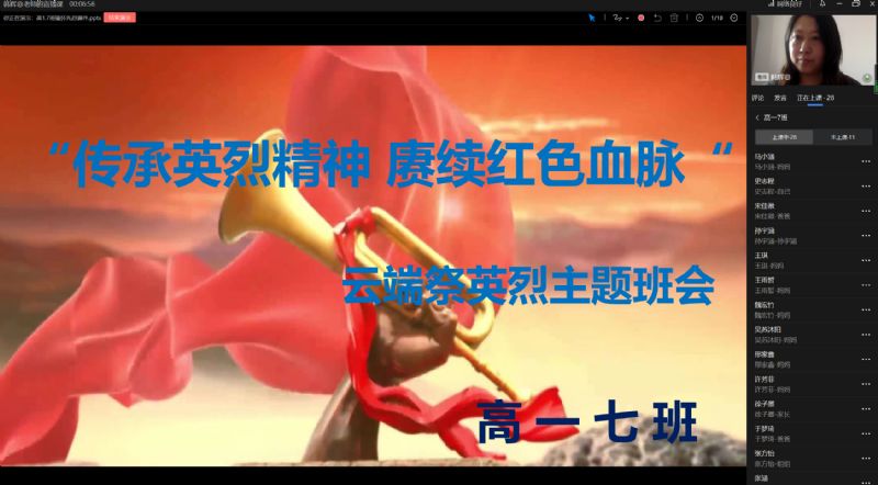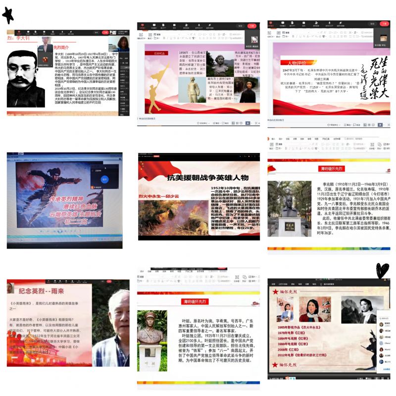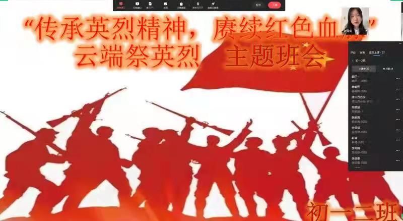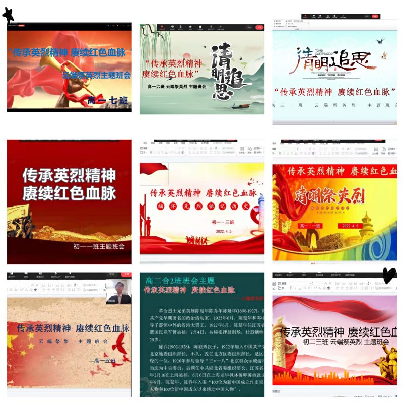 为创新思想政治教育形式,保障“云端祭英烈”活动高效开展,附中各班依托网络平台开展此次云班会活动。每个班级选取一位革命英烈,由班主任通过线上的方式结合相关视频和图片资料向学生讲述英烈的生平和光辉事迹,号召学生学习英烈人物的功勋事迹,重温百年党史,弘扬英烈精神。会上,学生们也纷纷表达了自己的感受,表示通过此次的主题班会再次深刻体会到了革命先烈的精神,并立志向革命先烈学习,争做弘扬爱国主义的时代先锋,使革命传统和优良作风薪火相传。