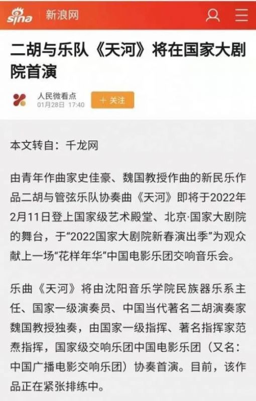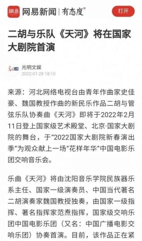 由青年作曲家史佳豪、魏国教授作曲的新国乐作品二胡与管弦乐队协奏曲《天河》2022年2月11日在北京·国家大剧院世界首演,由国家级乐团中国电影乐团(中国广播电影交响乐团)协奏于2022国家大剧院新春演出季《“花样年华”中国电影乐团交响音乐会》。