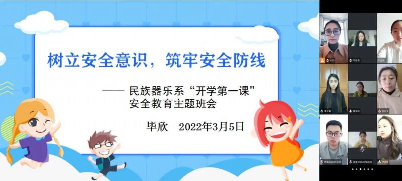 辅导员毕欣为2018级全体学生开展《树立安全意识,筑牢安全防线——民族器乐系“开学第一课”安全教育》主题班会,党总支副书记温雅参会。班会从国家安全、疫情防控、预防传染、消防安全、交通安全、谨防诈骗、网络安全、人身安全八个方面向同学们进行了安全教育,引导我系学生树立安全意识、筑牢安全防线。通过此次班会同学们深刻体会安全对自己、家庭和社会的重要性,提高了遇到危险时的自我警示、自我应对和自我保护能力。