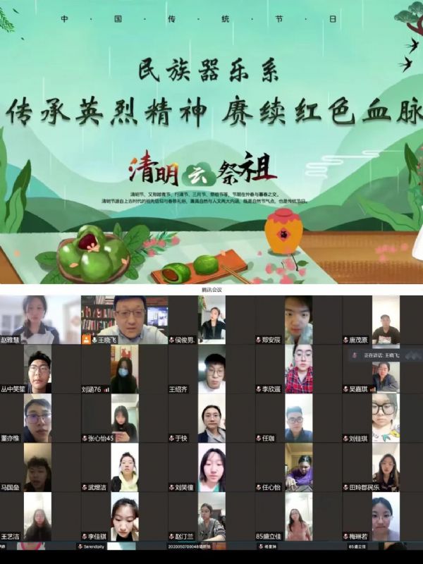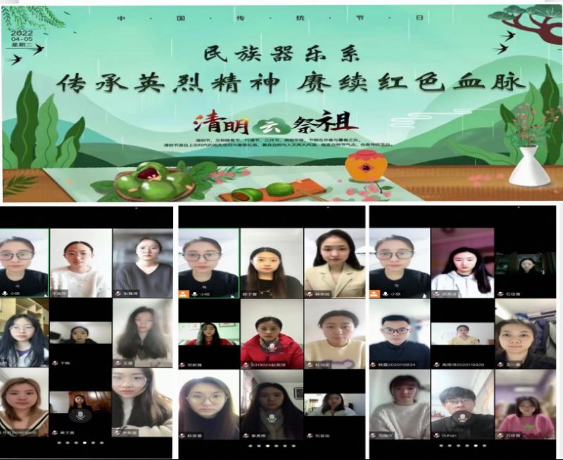 为深入弘扬英烈事迹和精神,引导广大学生传承革命先烈的优秀品质,引领崇尚、缅怀、学习、捍卫英烈的风尚,按照学院工作要求,4月5日,民族器乐系在全体学生中开展以“传承英烈精神 赓续红色血脉”为主题的“云端祭英烈”班会暨主题团日活动。