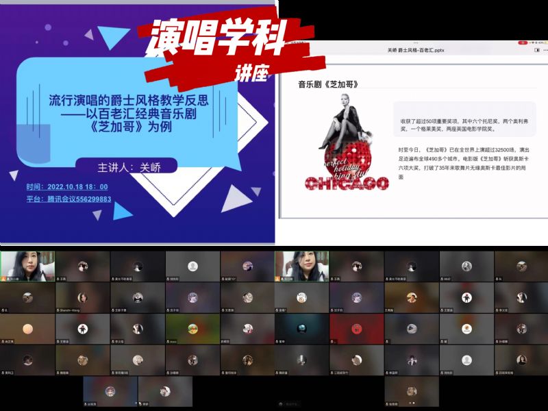 理论学科于秋爽老师的讲座《流金岁月—影视剧经典音乐赏析》娓娓动听、精彩绝伦;演唱学科关峤老师的讲座《流行演唱的爵士风格教学反思——以百老汇经典音乐剧“芝加哥”为例》经典片段赏析绘声绘色、声情并茂;键盘学科郝晋东、郭颖以及助讲嘉宾曹野、陈秋月老师的讲座《国际国内权威大赛(钢琴、双排键、手风琴)简述”》循循善诱、字字珠玑;管弦学科颜言老师的讲座名曲视听讲析《柴可夫斯基第六交响曲“悲怆”》 行云流水、引人入胜;民乐学科潘黎老师的讲座 《中国民族器乐经典作品鉴赏》妙语连珠、抑扬顿挫。