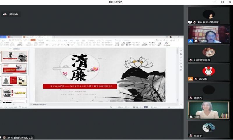 管宁以“遵纪守法 廉洁自律”为主题,以戏剧影视学院学生管理工作为切入点,深入剖析“廉洁”的内涵,强调崇洁尚廉,需要厚植高尚自律的职业素养。她引经据典,以一个个真实鲜活的事例,既有正面的榜样故事感染学生,又有反面典型案例警示大家,她教育学生既要学会修身养廉,还要警惕身边腐败文化的侵袭,要从思想上筑起“廉洁防火墙”。最后,她提出三点希望:一是要在学史明理中涵养清廉之风;二是要在学史增信中筑牢清廉防线;三是要在学史カ行中争做清廉表率。她号召大家,积极行动起来,树立廉洁修身、廉洁从业的思想观念,做一名新时代的廉洁青年。