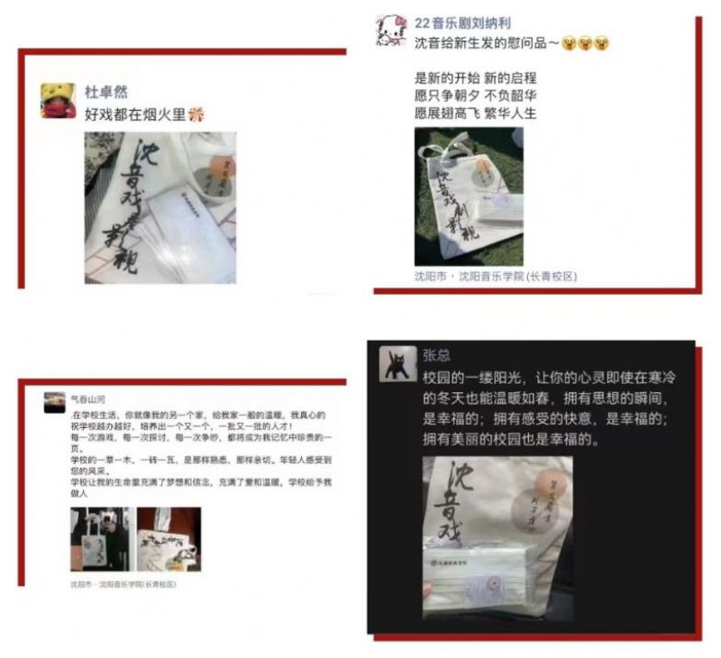 喜迎二十大,启航向未来。在中国共产党第二十次全国代表大会召开之际,戏剧影视学院迎来了2022级的419名新同学。为了让新生更快融入集体生活,充分感受戏剧影视学院这个大家庭的温馨氛围,学院精心策划,充分发挥专业优势,自主设计富有戏剧影视学院文化属性的帆布袋和带有戏剧影视学院标识的口罩作为欢迎新生入校的“见面礼”,于10月18日送至新同学手里。收到学院极具创意的迎新小礼物后,学生们激情澎湃,神采飞扬,我是“戏剧人”的强烈身份感和归属感油然而生。大家纷纷转发朋友圈“炫耀”,引起了广泛点赞和热烈讨论。大家都表示入学“见面礼”充分体现了学院无微不至的人文关怀,都为自己能成为戏剧影视学院大家庭中的一员而感到自豪。