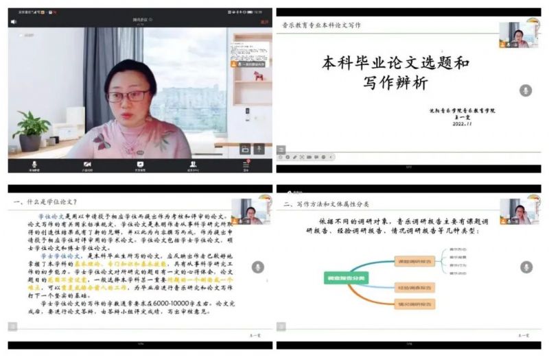 音乐教育系于2022年10月28日10:00,采用腾讯会议的形式,开展了教学质量月系列活动——《本科毕业论文选题和写作辨析》,主讲人王一雯。本次活动首先介绍了学士学位论文的性质、定义,并由此引出论文选题要“以小见大”;其次,讲座对音乐教育方向的学位论文从学科分类、写作方法和文体属性以及科学研究等不同视角,分别介绍了论文选题需要注意的方面及问题;最后介绍了论文正文书写需要注意的格式规范。