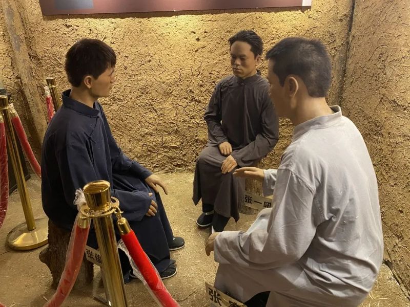 第一展厅——“星火燎原”主题展览,一间20平方米的茅草屋生动还原了中国共产党在苏家屯地区开展抗日救亡工作时的情景。进门处张一吼、张俊庸和张寒的复原蜡像生动鲜活,这是无数个日夜他们商讨革命斗争形势,创新革命工作方法的缩影。