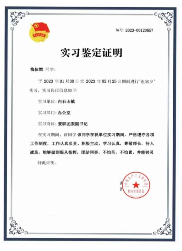 实践经历:通过“返家乡”平台被吉林省白石山镇政府录用,主要负责收发文件、编辑文稿、接打电话、记录会议通知、整理党籍文书等。