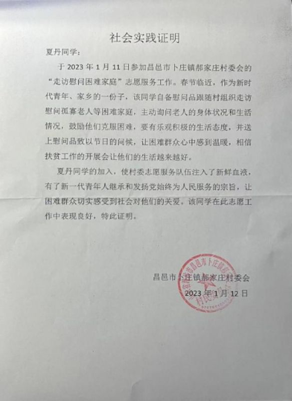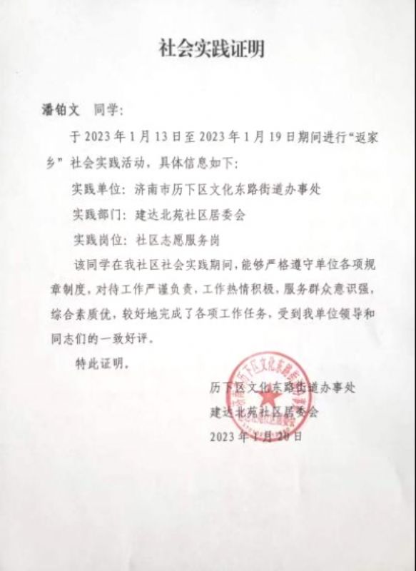 实践经历:完成社区宣传禁放禁燃烟花爆竹行动、发放禁燃宣传手册、清理社区卫生、协助整理社区居民资料等。