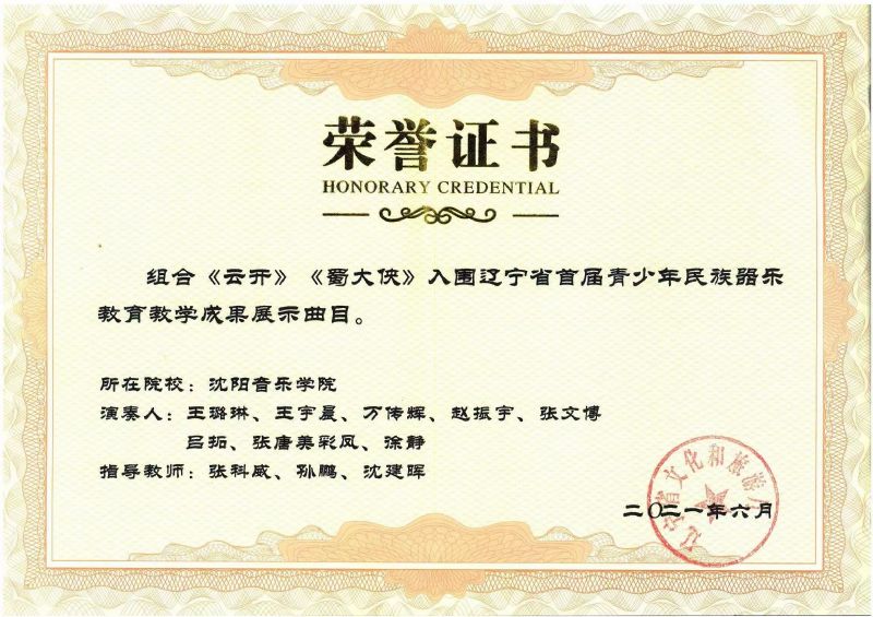 2021年6月,民乐系组合(王璐琳、王宇晨、万传辉、赵振宇、张文博、吕拓、张唐美彩凤、徐静)演奏的《云开》《蜀大侠》入围辽宁省首届青少年民族器乐教育教学成果展示曲目,组合的指导教师为张科威、孙鹏、沈建晖。