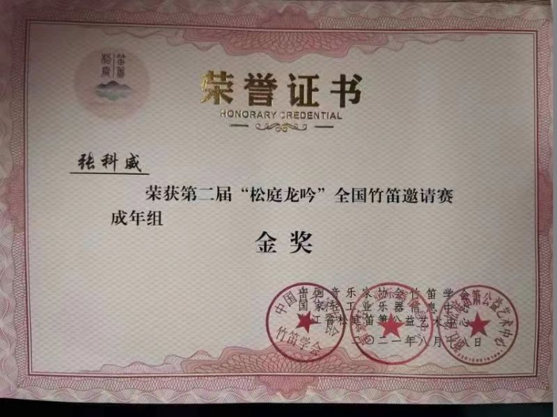 2021年8月18日,在中国音乐家协会竹笛协会、国家轻工业乐器信息中心、浙江省松庭笛萧公益艺术中心主办的第二届“松庭龙吟”全国竹笛邀请赛中,我系张科威副教授荣获金奖。