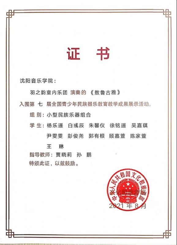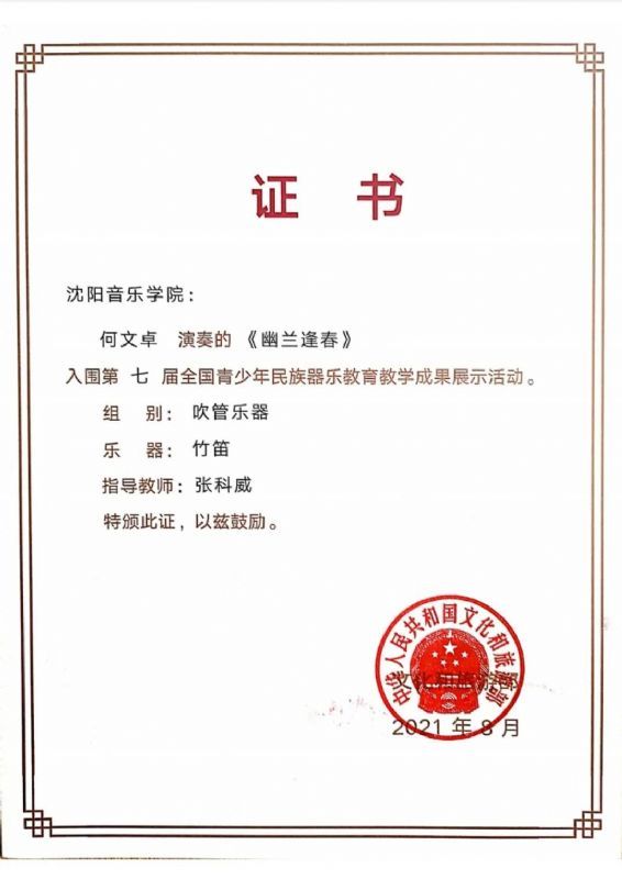 2021年8月,在文化和旅游部主办的“第七届全国青少年民族器乐教育教学成果展示活动”中,民族器乐系2019级竹笛专业研究生何文卓演奏的《幽兰逢春》(指导教师:张科威)和“羽之韵室内乐团”演奏的《敖鲁古雅》(指导教师:贾晓莉、孙鹏)入围全国展演。