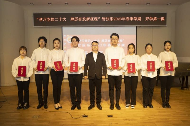 管弦系副主任庞亮、关立红分别宣读了2022-2023学年度第一学期我系各类学生活动评优表彰决定,并勉励管弦系全体学生要以“大鹏一日同风起,扶摇直上九万里”的豪情,在本学期的各项学习与活动中,奋勇争先,再创佳绩。各教研室主任向优秀学生和先进个人颁发了证书。
