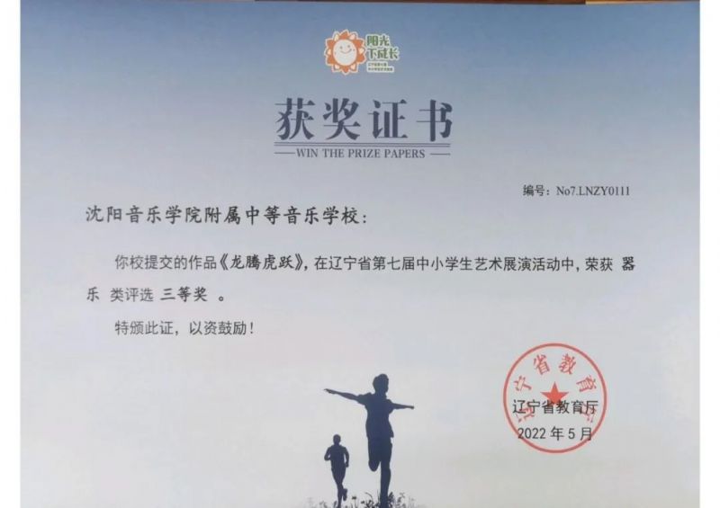 在2022年5月结束的“辽宁省中小学生艺术展演”中,由我校教师于泳、胡天纵、李晓军指导的作品《抒情曲》荣获器乐类评选一等奖,潘黎指导的《踏莎行》荣获器乐类评选一等奖,潘伟华指导的《我和我的祖国》荣获器乐类评选二等奖,潘黎指导的《龙腾虎跃》荣获器乐类评选三等奖。