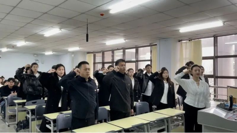 学生党支部书记易美含带领全体党员庄严肃立,面向党旗重温入党誓词,短短12句,却字字千钧。庄严而铿锵的宣誓声回荡在每一个人的耳边,是鞭策、是激励、是鼓舞,理想信念在铮铮誓言中更加坚定!