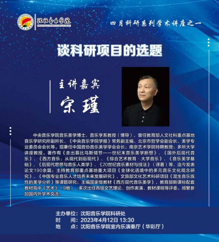 科研处将于四月举办《谈科研项目的选题》(宋瑾教授);《音乐类课题项目申报的选题与设计》(杨玉成教授);《中华民族音乐文化瑰宝一中国维吾尔木卡姆》(赵塔里木教授)系列讲座。
